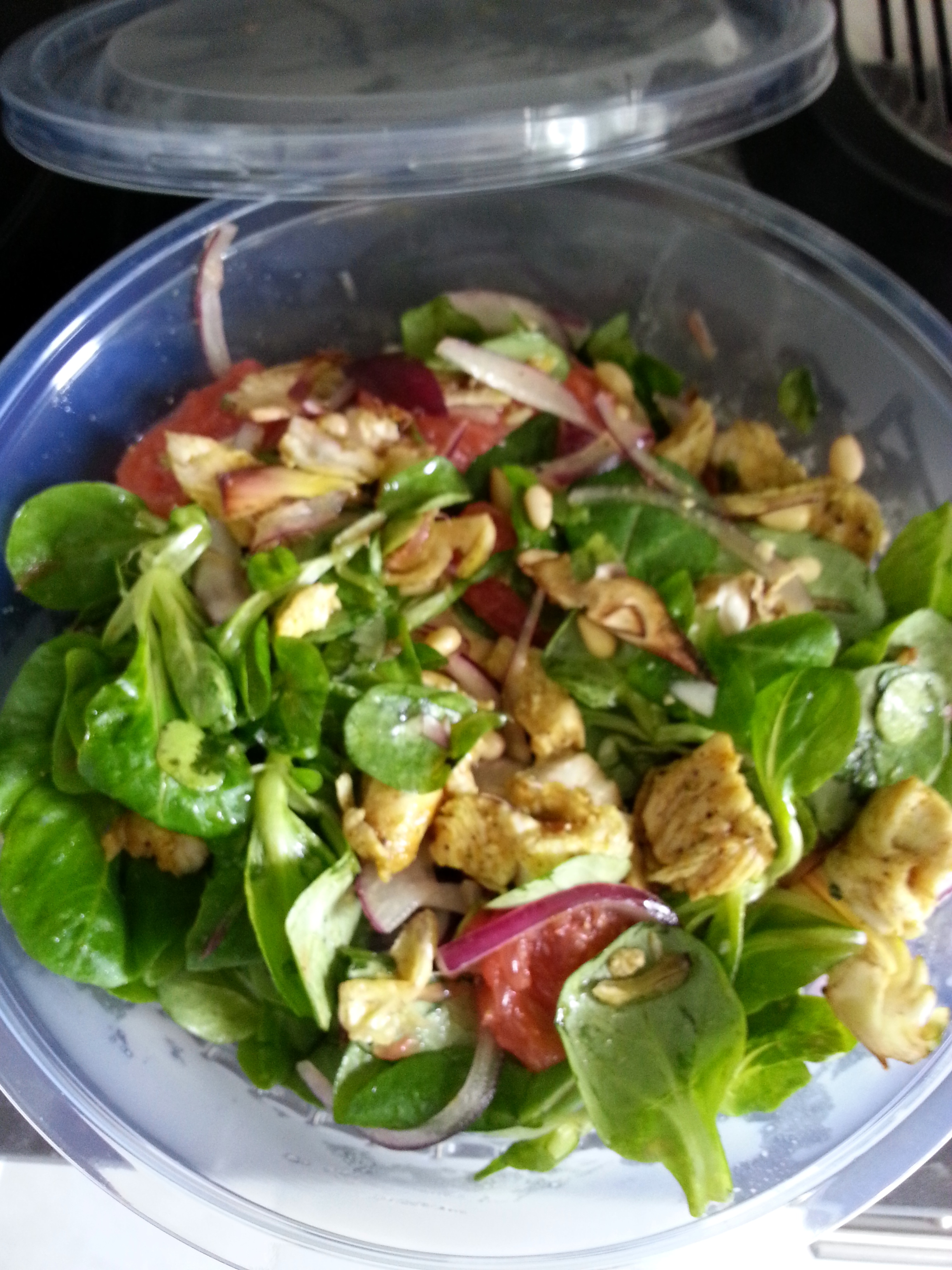 Ma salade favorite: Pousses d’épinard, pamplemousse, poulet épicé, pignons, oignons rouge, artichauts poivrade.